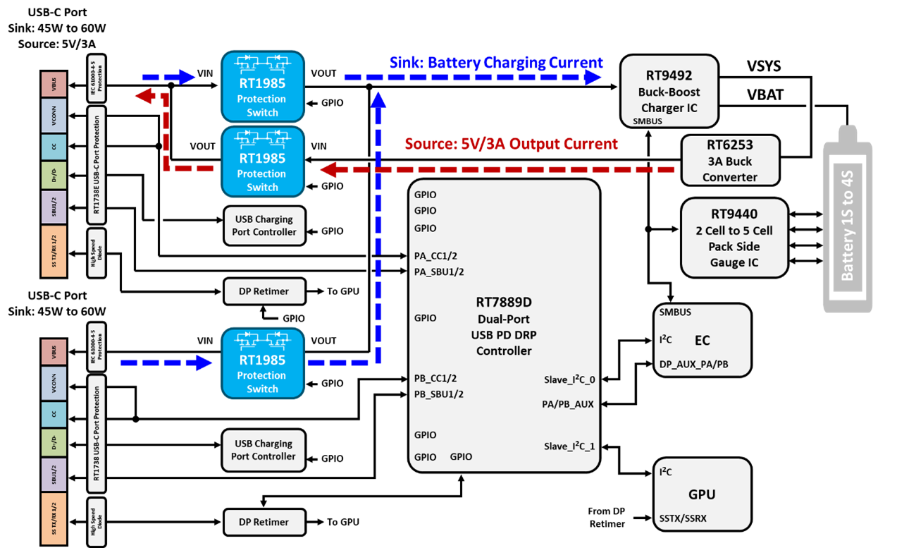 Protection switches play a critical role in USB-C and Thunderbolt applications, not only providing power control functionality but also safeguarding the system against surge and backflow risks during dynamic power negotiation processes.RT1985Capable of managing both Sink and Source power paths simultaneously, it is applied in dual-port USB PD devices.