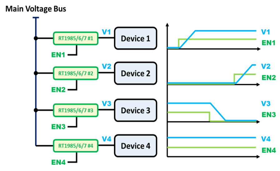 保护开关无需机械继电器,即可轻松实现负载的电源接通与断开控制,有助于电源排序与动态功率管理。RT1985/RT1986/RT1987通过主动高电位(active-high)的 EN 引脚,精确控制电源通路开启的时机。当 EN 为高电位且输入电压高于 UVLO 阈值时,电源通道将在设定的延迟时间后启动,并具备可控的电压上升斜率,确保上电过程稳定可靠。